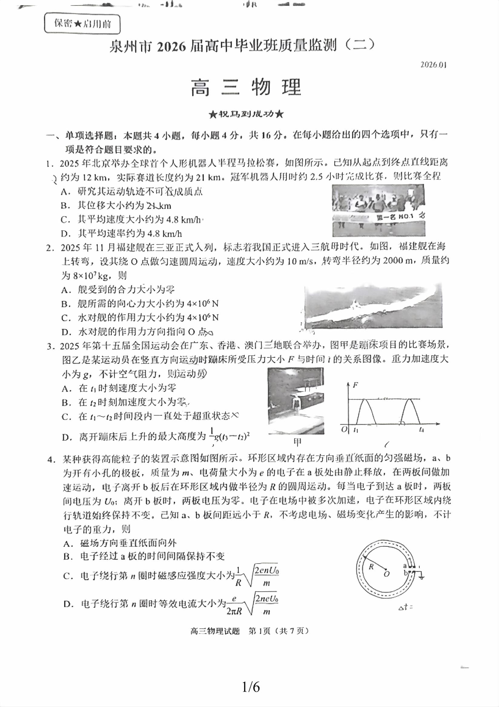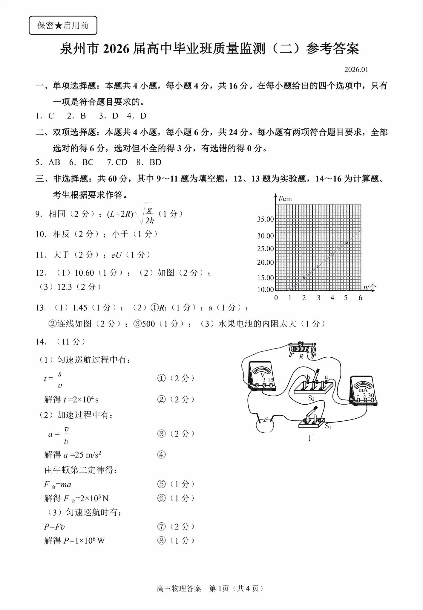 【已更新】2026泉州二检试题及答案(物理)