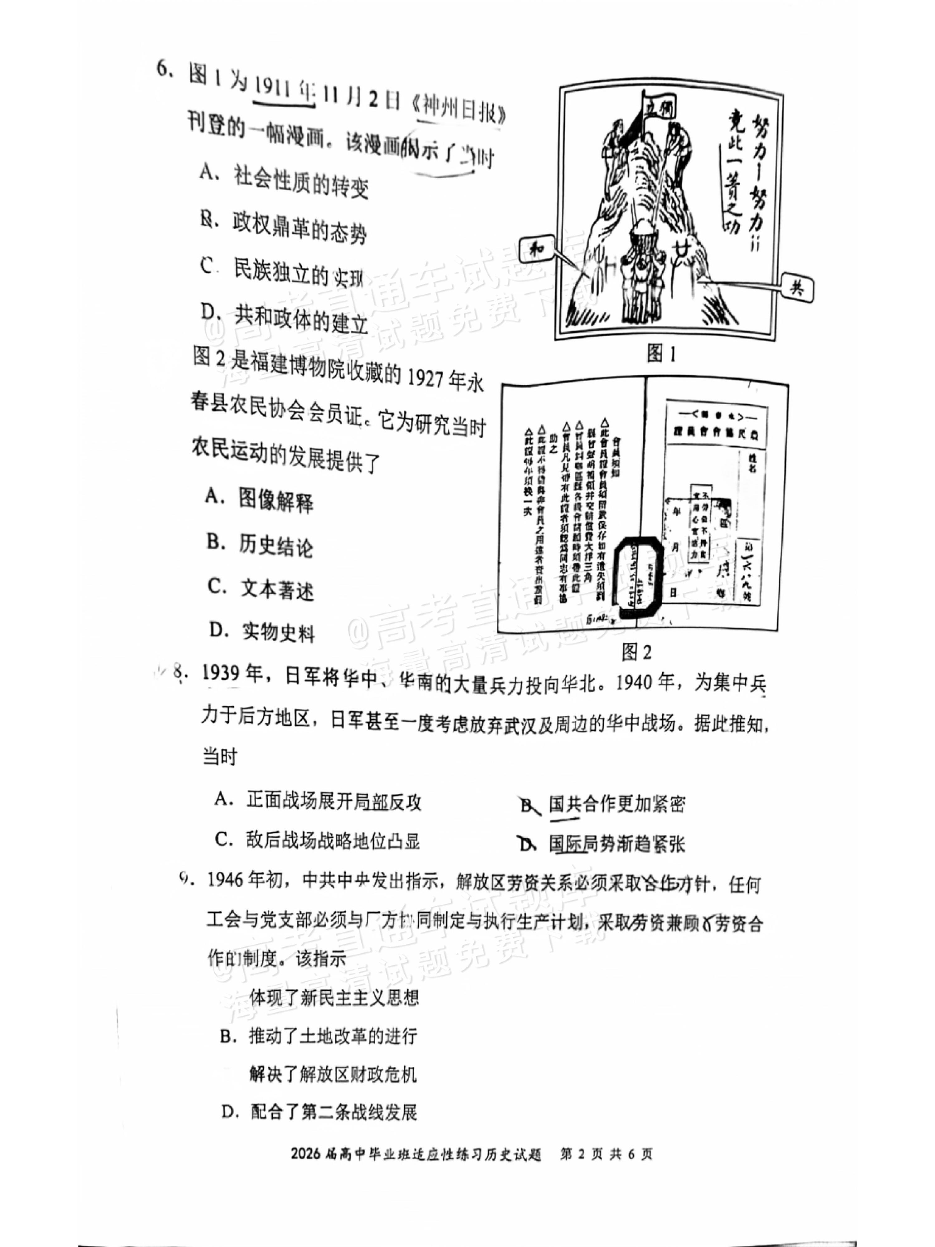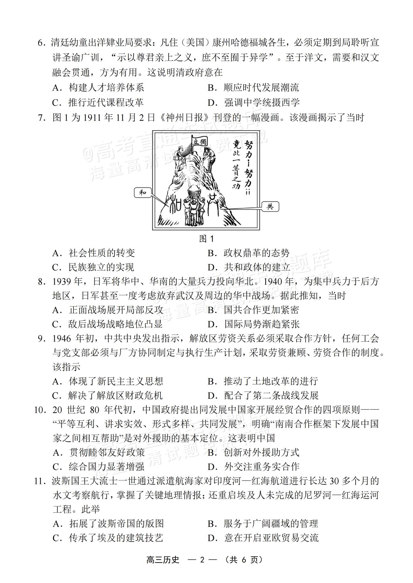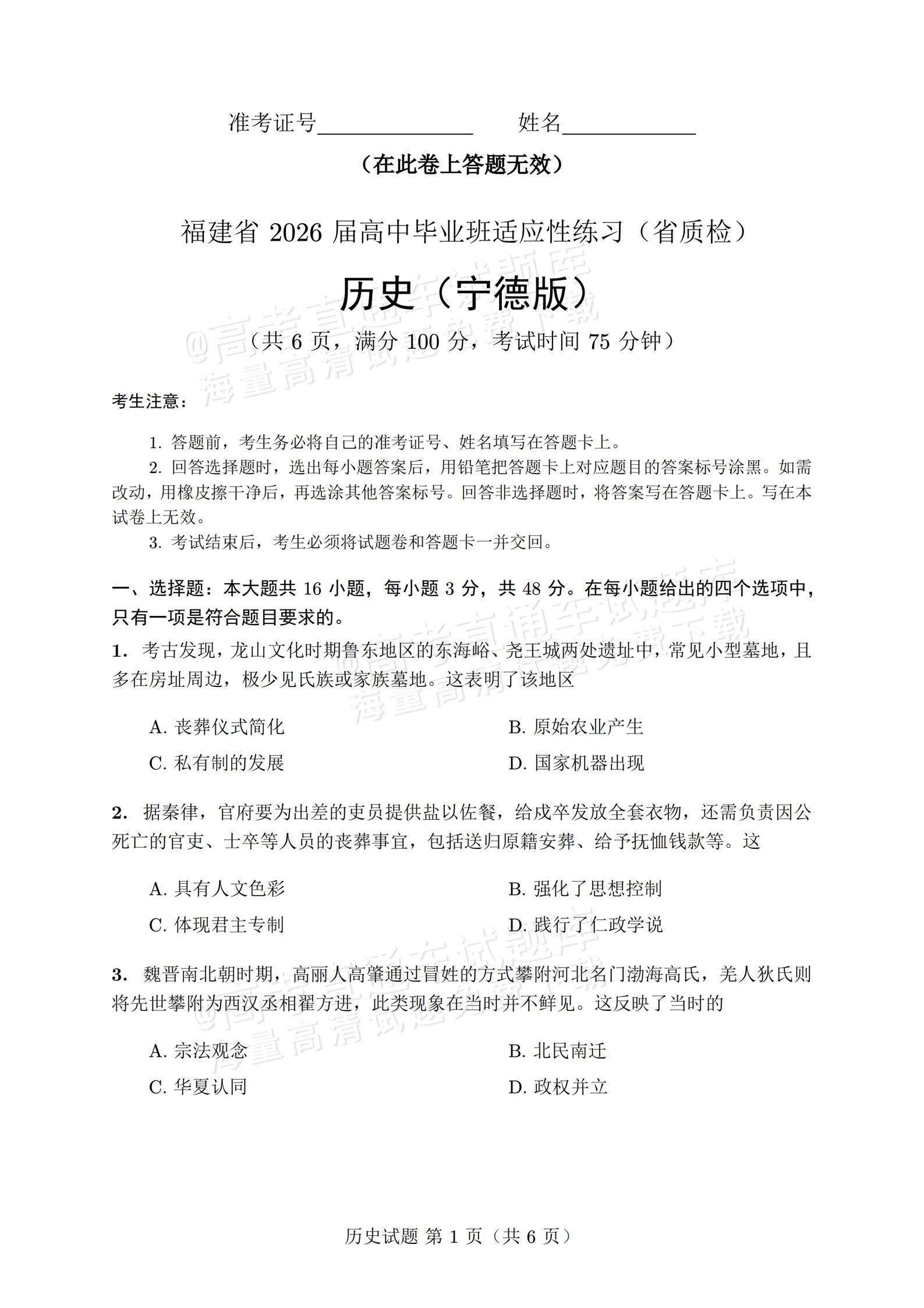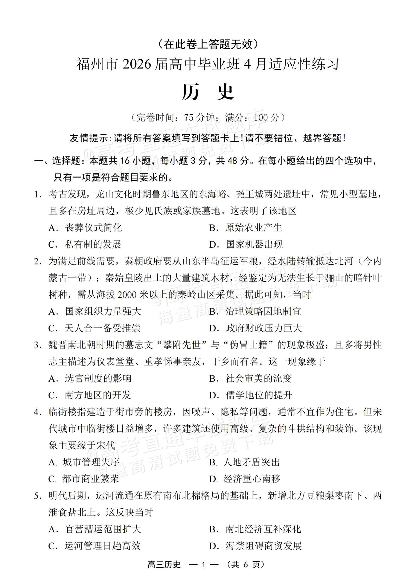 【已更新】2026年福建高三4月省质检试题及答案(历史)